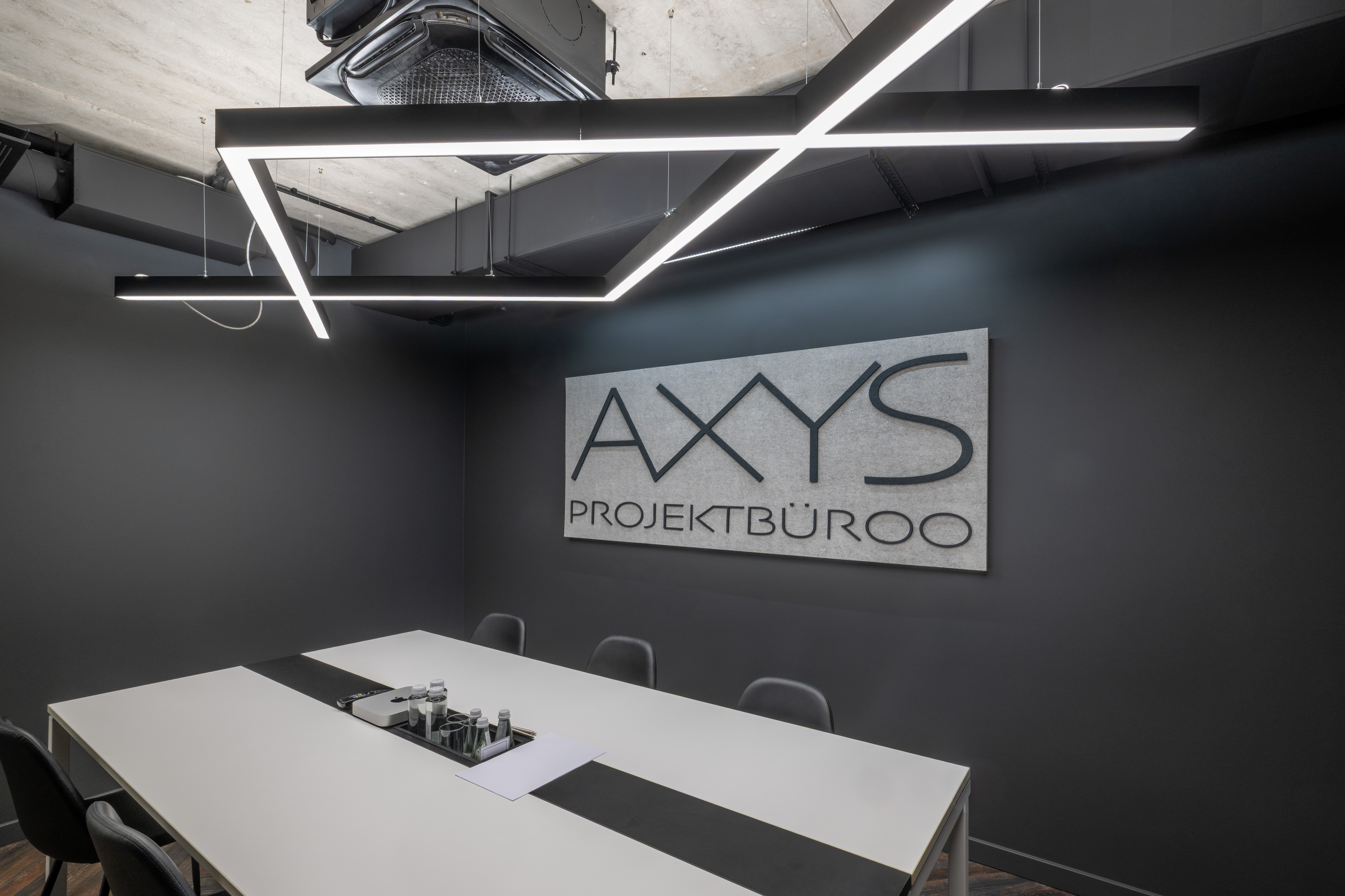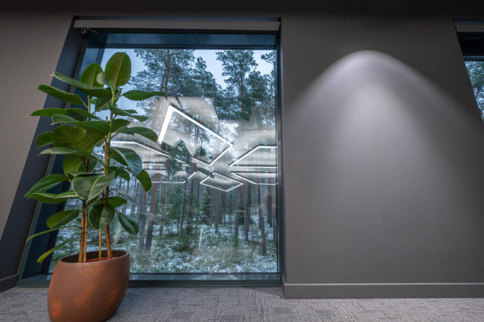 The office space of Axys biro from Estonia features 𝘀𝘁𝗿𝗶𝗸𝗶𝗻𝗴, 𝗹𝗮𝗿𝗴𝗲-𝘀𝗰𝗮𝗹𝗲 𝗜𝗟𝗢 𝗹𝘂𝗺𝗶𝗻𝗮𝗶𝗿𝗲𝘀 𝗱𝗲𝘀𝗶𝗴𝗻𝗲𝗱 𝗮𝘀 𝟲 𝗿𝗵𝗼𝗺𝗯𝘂𝘀 𝘀𝗵𝗮𝗽𝗲𝘀. 𝗘𝗮𝗰𝗵 𝗹𝘂𝗺𝗶𝗻𝗮𝗶𝗿𝗲 𝗶𝘀 𝗼𝘃𝗲𝗿 𝟯 𝗺 𝗹𝗼𝗻𝗴 𝗮𝗻𝗱 𝘄𝗮𝘀 𝗽𝗿𝗼𝗱𝘂𝗰𝗲𝗱 𝗮𝘀 𝗼𝗻𝗲 𝗰𝗼𝗺𝗽𝗹𝗲𝘁𝗲 𝗽𝗶𝗲𝗰𝗲, 𝗮𝗹𝗹𝗼𝘄𝗶𝗻𝗴 𝗶𝘁 𝘁𝗼 𝗯𝗲 𝗱𝗲𝗹𝗶𝘃𝗲𝗿𝗲𝗱 𝗳𝘂𝗹𝗹𝘆 𝗮𝘀𝘀𝗲𝗺𝗯𝗹𝗲𝗱. The client received the luminaires packaged and ready to install – no on-site assembly required, only suspension.