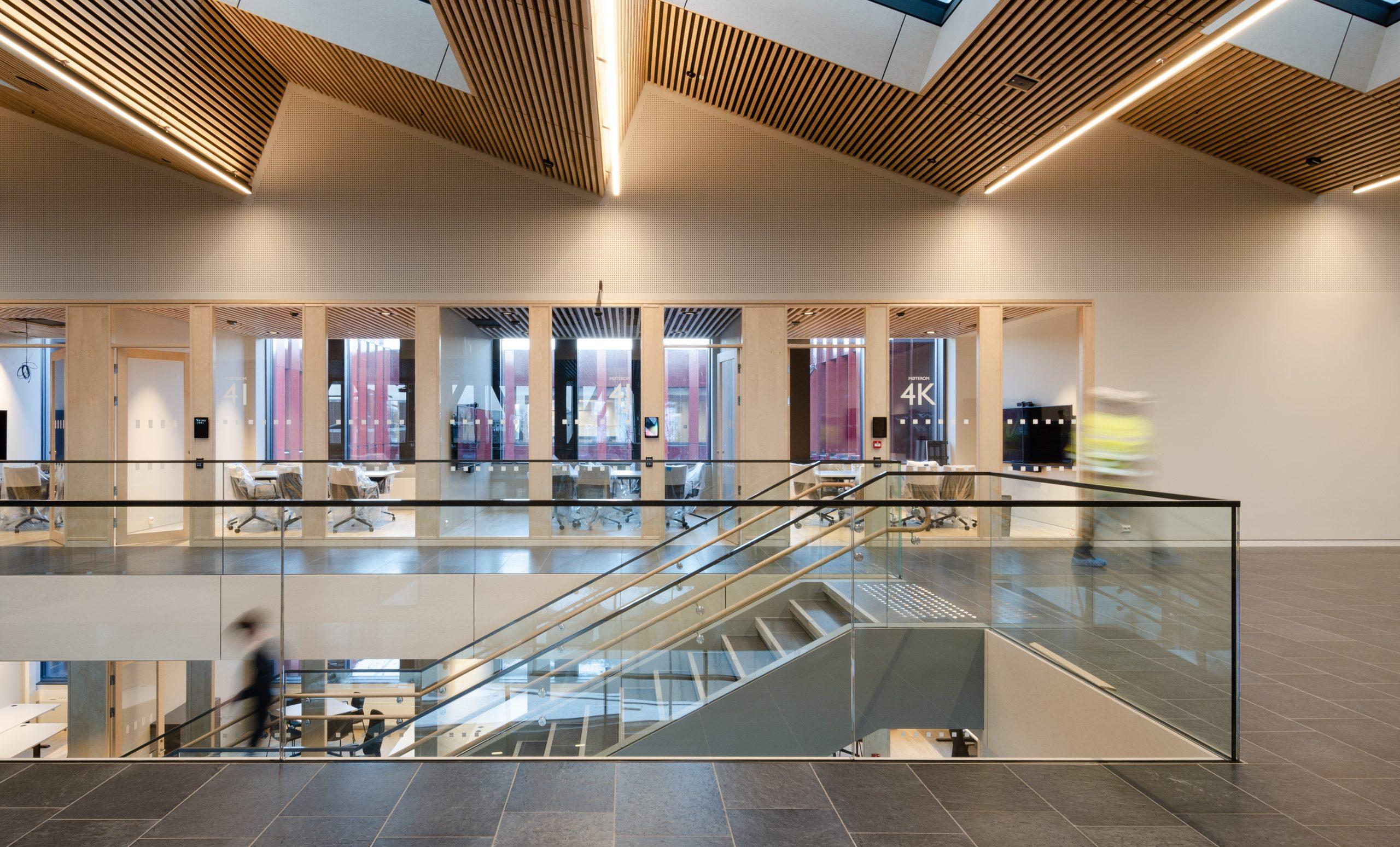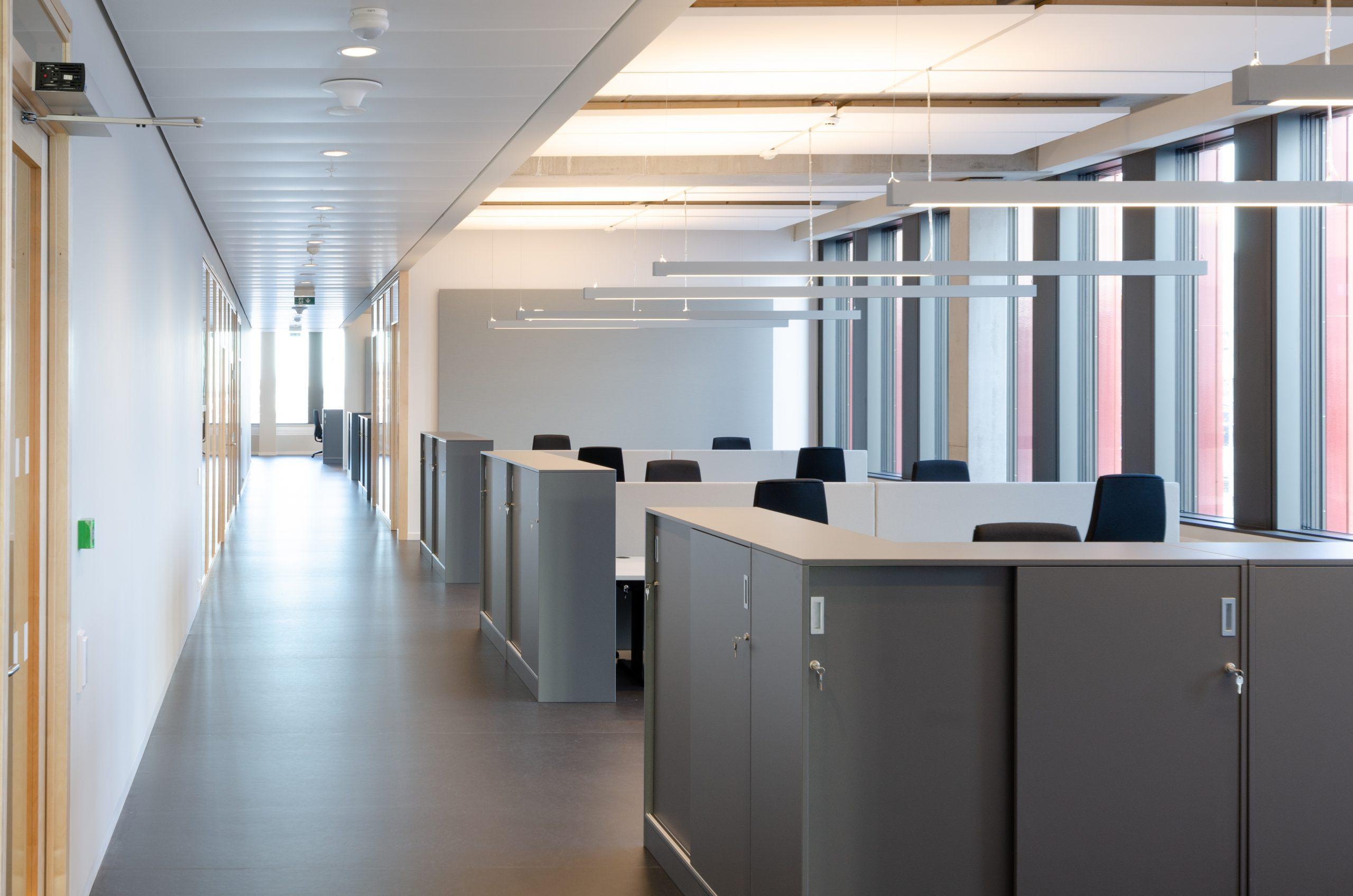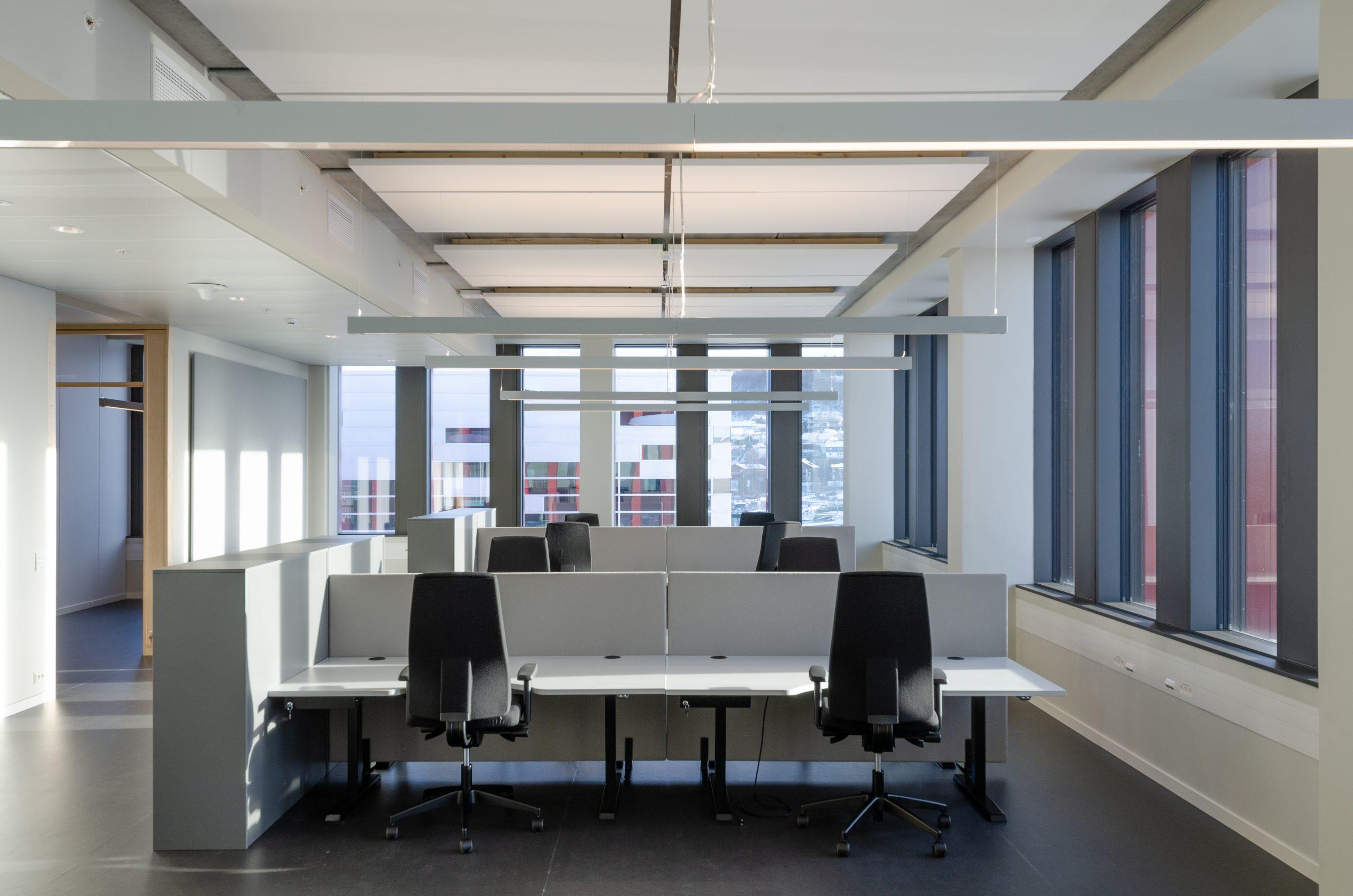 ILO pendant and ceiling luminaires with specifically set direct and indirect light distribution were installed across all office workplace as well as in the large stairwell in the center of the building, where the fittings were mounted on ceiling brackets. All pendants are equipped with Active+ sensor from Helvar with daylight harvesting and presence detection functionality. Automatically controlled luminaires adjust the amount of light according to brightness, daylight and presence in the room, creating an interactive experience and adjusting the light when needed.