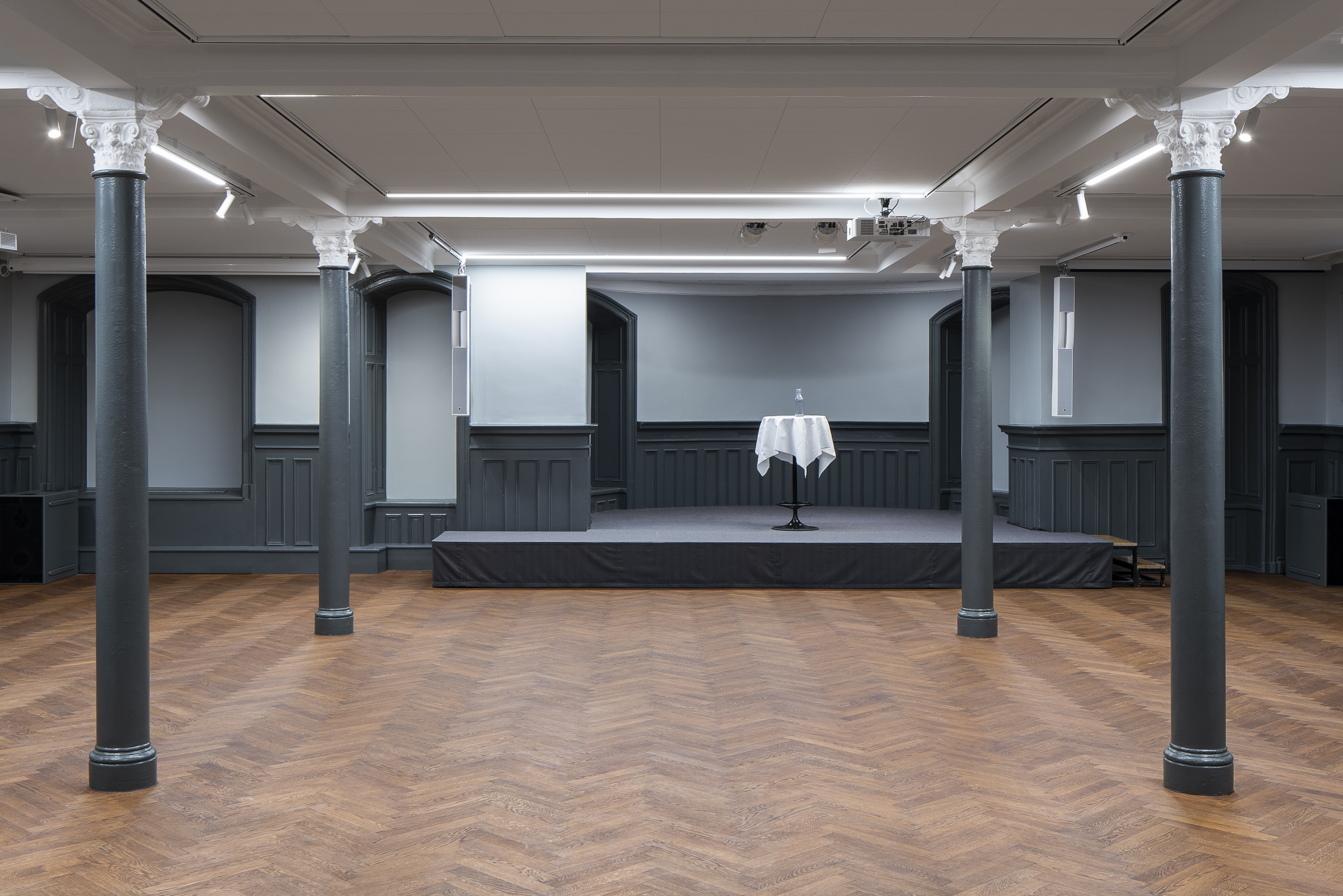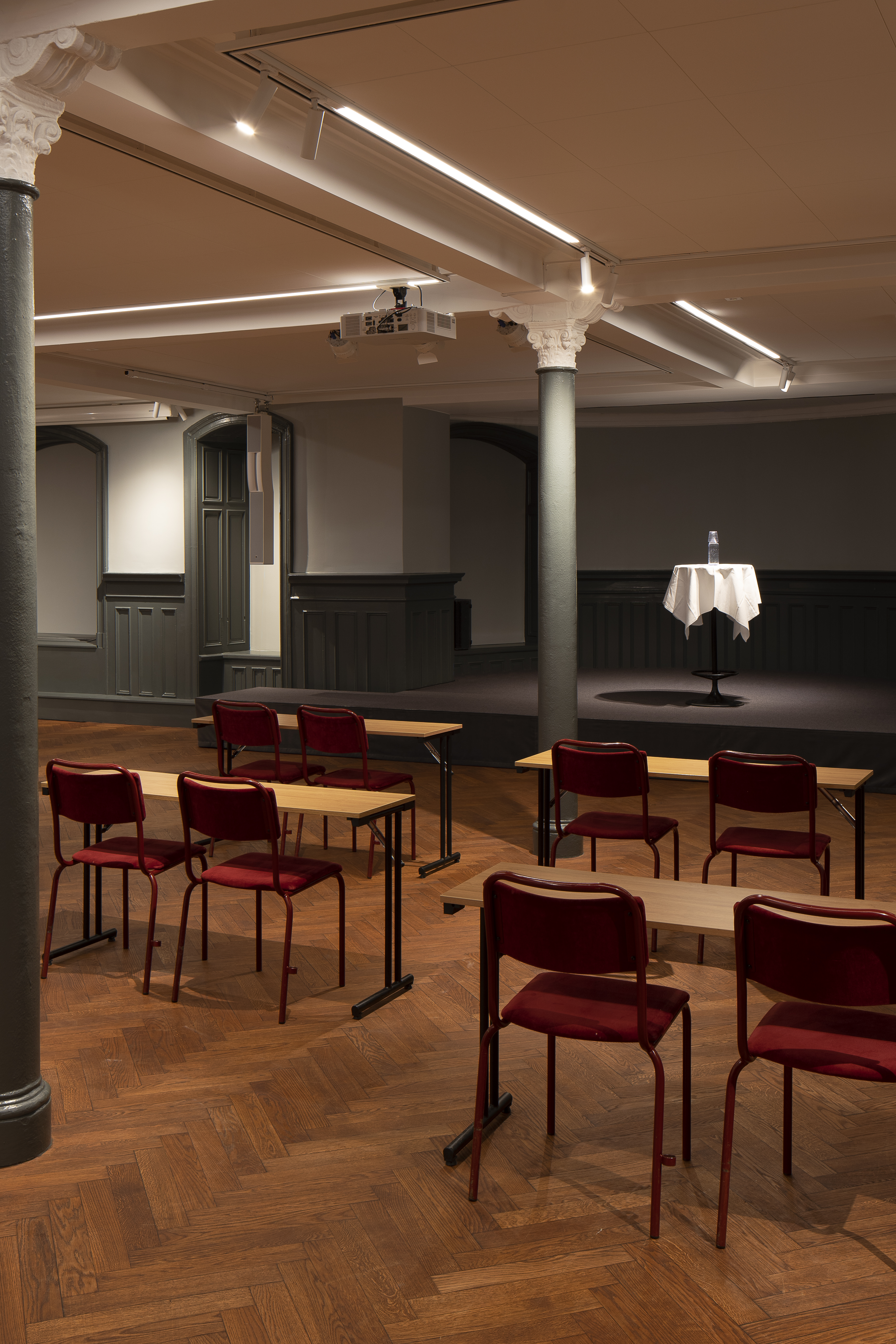 A conference room used for a variety of events and parties has received a face lift with new lighting technology and light fixtures. Linear light and spotlights accentuate and complement the interior; the warm gray linseed oil walls, the pillars, the white stucco and the beautiful parquet floors. Pelarsalen is one of Nalen's eight premises in central Stockholm.
