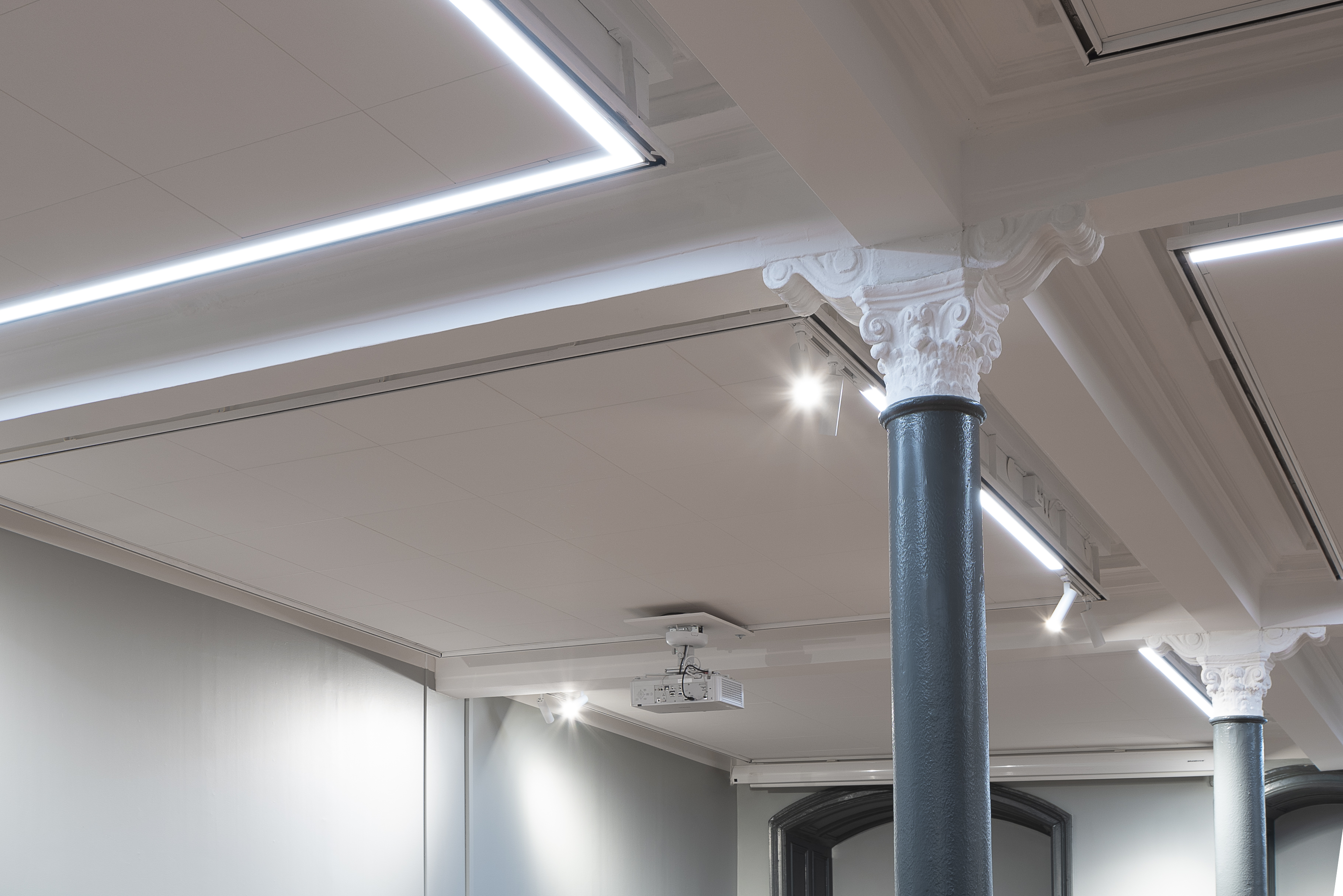 The lighting gives the room a facelift with new light lines and spotlights highlighting the enriched rooms with warm gray linseed oil painted walls, white stucco ceilings, pillars and beautiful parquet floors. At the same time, the selected light fixtures communicate a sense of modernity and the technology is highly contemporary.